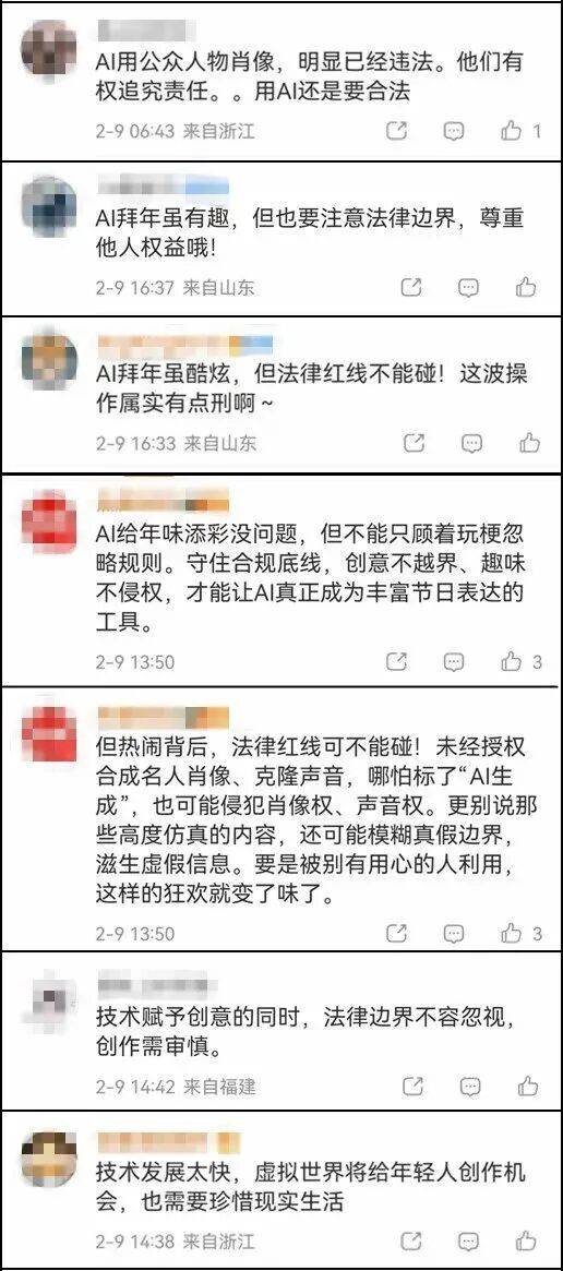 随之而来的是一种难以言说的“违和感”。但大量用户自行生成的贺年、春晚内容,该当严酷落实相关的办理法子所的标识的权利。正在接到人发出的侵权通知之后,可是有一些画面做得比力高耸,两者连系起来就能够生成看上去像本人的贺年短视频。通过大模子进修实正在人物的面部特征、脸色、嘴型等消息,记者搜刮了AI名人贺年等相关模版的授权环境,制做、转发侵权内容。包罗了两个环节部门:起首是视觉合成手艺,感受跟这小我日常平凡给我们的印象有点不太一样,人脸、人声属小我消息,手艺带来的“别致反差”正在短时间内赔脚了流量。肖倩说:“大师都感觉很成心思,然后将这些特征合成到新的素材中,从而让画面看起来像是实人正在措辞;给大师贺年。小品演员冯巩、蔡明和明星刘德华等人正正在网友家中围正在一路包饺子,但热闹背后!
